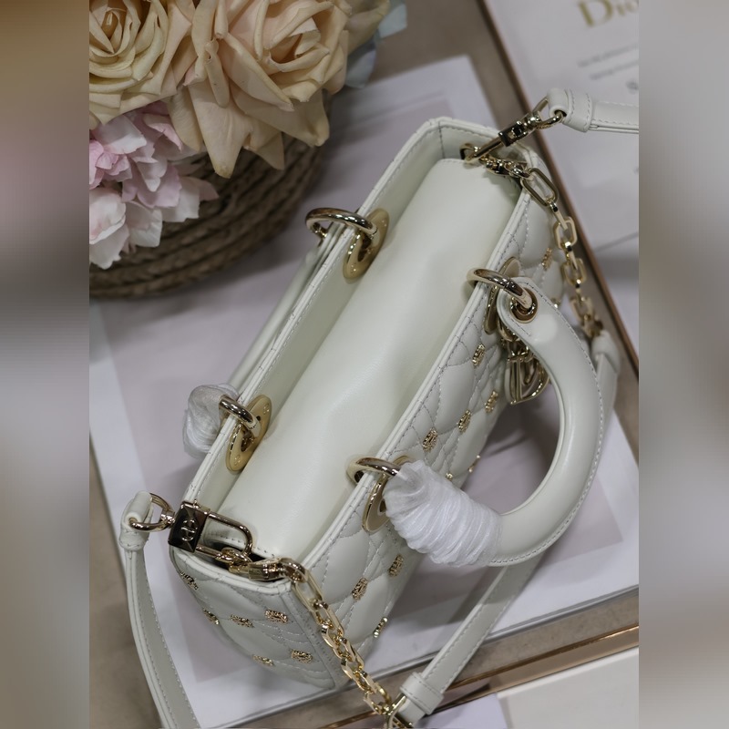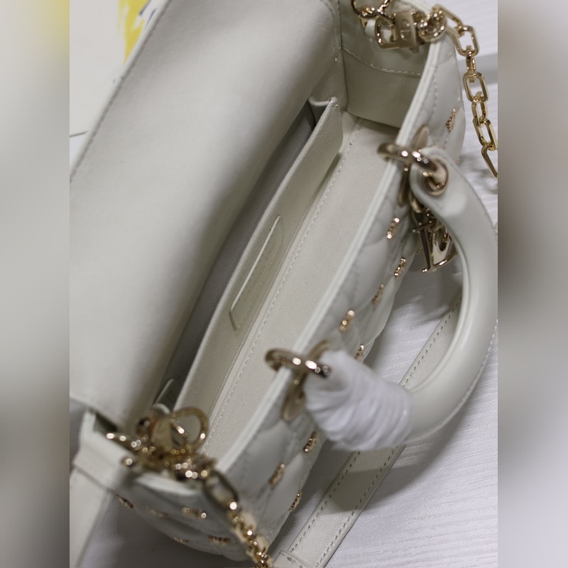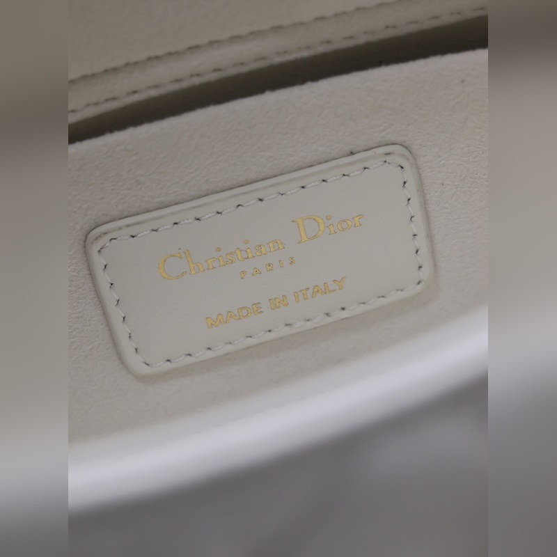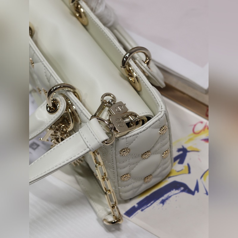 진짜 높은 버전 작은 LADY D-JOY 백 해바라기 화이트 이 레이디 디올 백은 레이디 디올 라인의 미니멀리즘 미학을 상징하며 디올의 우아함과 아름다움에 대한 깊은 이해를 담고 있습니다. 화이트 램스킨으로 제작되었으며 골드 마감의 메탈 해바라기 스터드와 라탄 효과의 탑스티치로 장식되어 있으며 라이트 골드 마감의 메탈 선 참과 화이트 레진 비즈가 달린 D.I.O.R. 참이 절묘한 실루엣에 생동감을 더합니다. 중간 사이즈 모델은 손으로 들거나 어깨에 메거나 크로스 바디로 메는 것이 가능하며 탈착식 체인 숄더 스트랩과 길이 조절이 가능한 탈착식 가죽 숄더 스트랩이 있어 일상적인 스타일링에 이상적입니다. 탈착식 체인 숄더 스트랩 탈부착이 가능한 가죽 어깨끈 내부 패치 포켓 모델: 0540 크기: 22 x 12 x 6cm