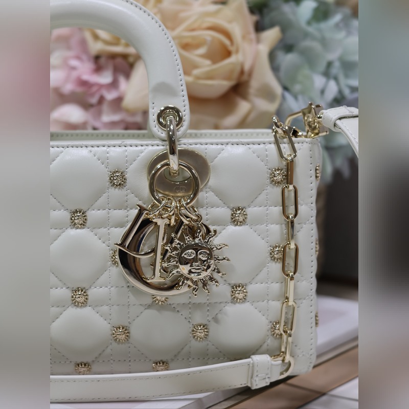 진짜 높은 버전 미디엄 레이디 D-조이 백 해바라기 화이트 이 레이디 디조이 백은 레이디 디올 라인의 미니멀리즘 미학을 상징하며 디올의 우아함과 아름다움에 대한 깊은 이해를 담고 있습니다. 화이트 램스킨으로 제작된 이 백은 해바라기 모양의 골드 마감 금속 스터드와 라탄 패턴의 탑스티치로 장식되어 있으며 가벼운 골드 마감 금속 태양 장식과 화이트 레진 비즈가 달린 D.I.O.R. 참이 절묘한 실루엣에 움직임의 감각을 더해줍니다. 중간 사이즈 모델은 손으로 들거나 어깨에 메거나 크로스 바디로 메는 것이 가능하며 탈착식 체인 숄더 스트랩과 길이 조절이 가능한 탈착식 가죽 숄더 스트랩이 있어 일상적인 스타일링에 이상적입니다. 탈착식 체인 숄더 스트랩 탈부착이 가능한 가죽 어깨끈 내부 패치 포켓 모델: 0540 크기: 26×13.5×5cm 아이폰과 기타 액세서리를 잡을 수 있습니다.