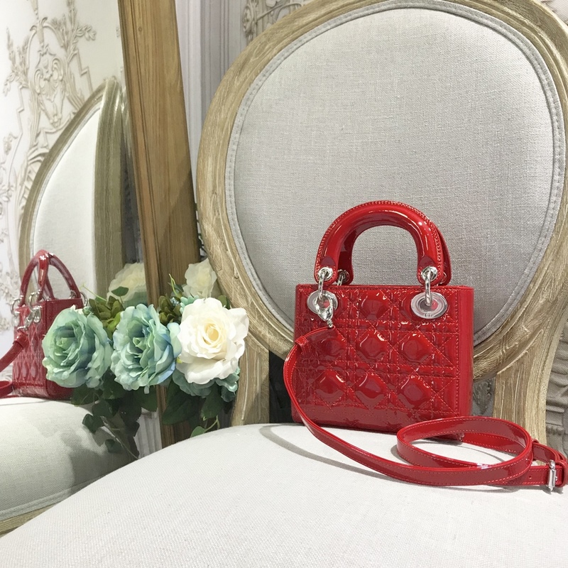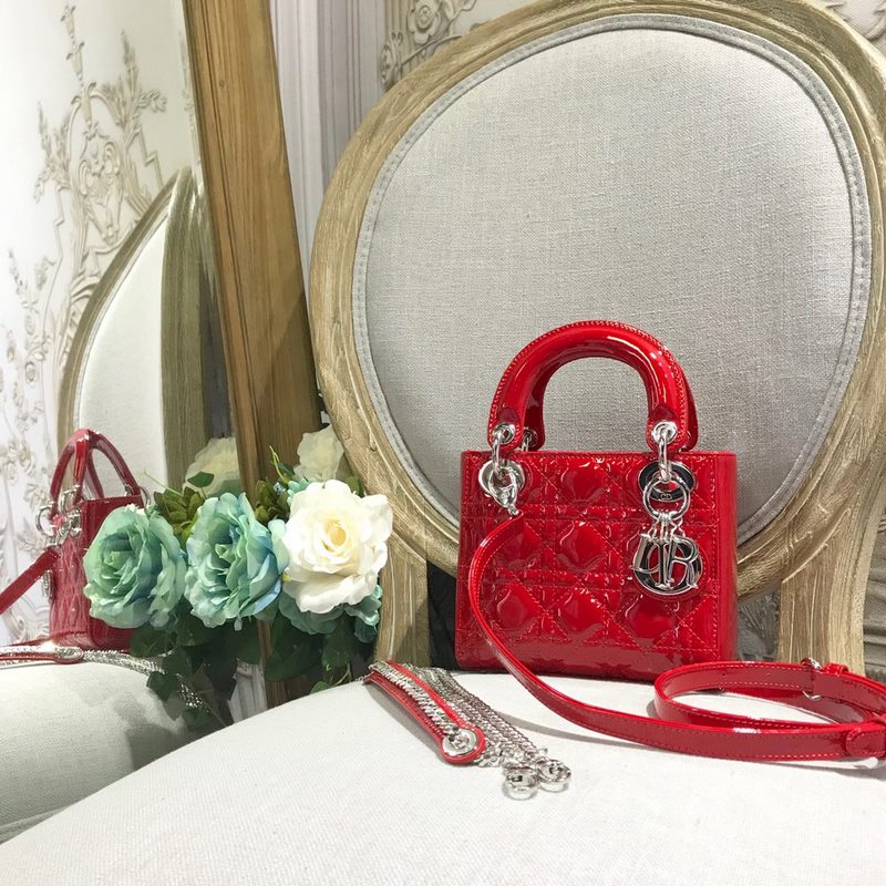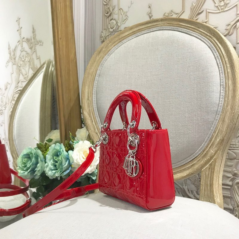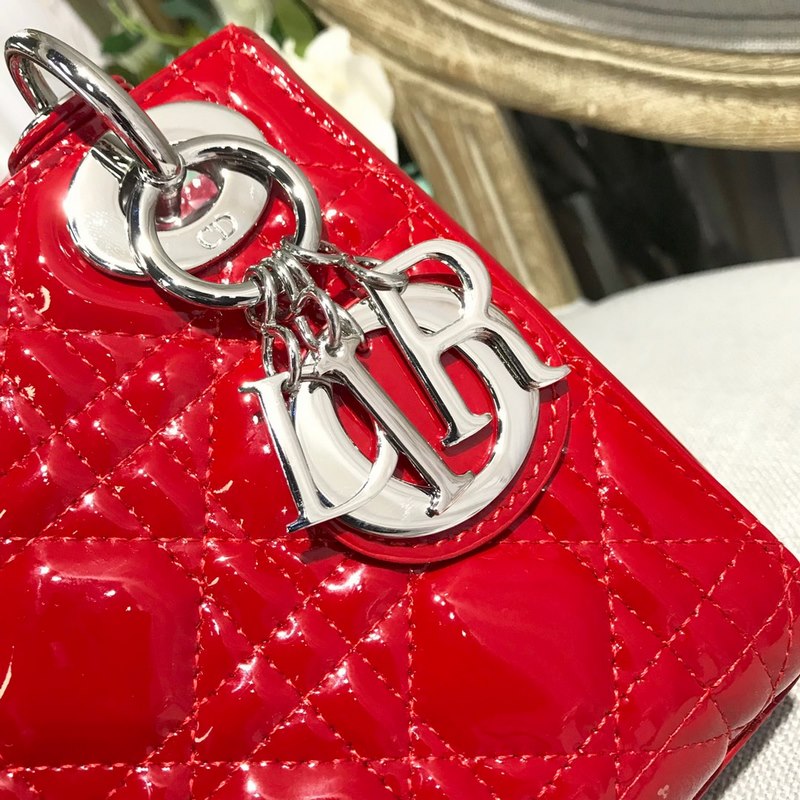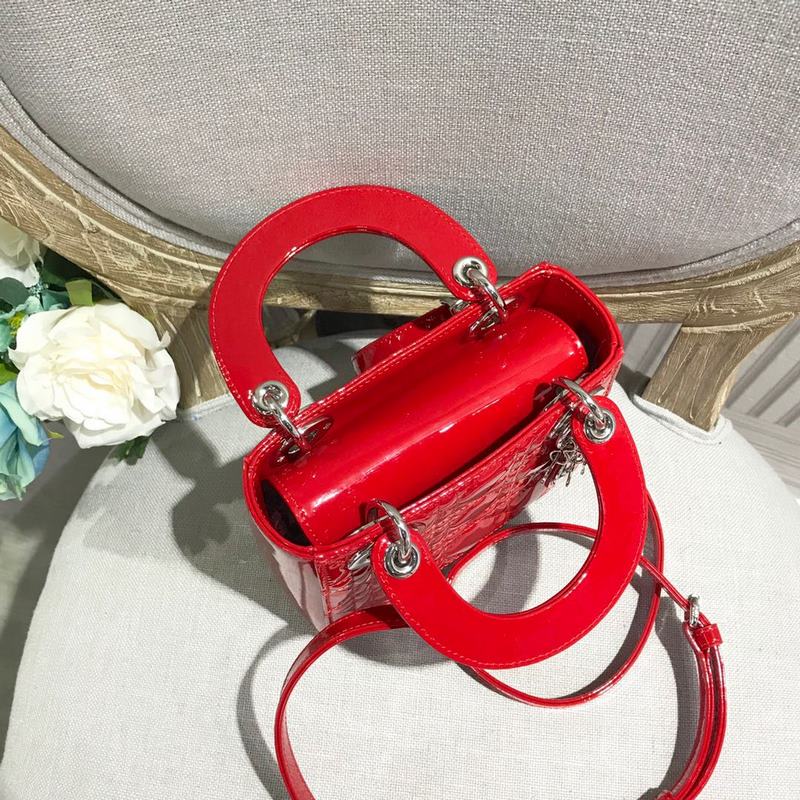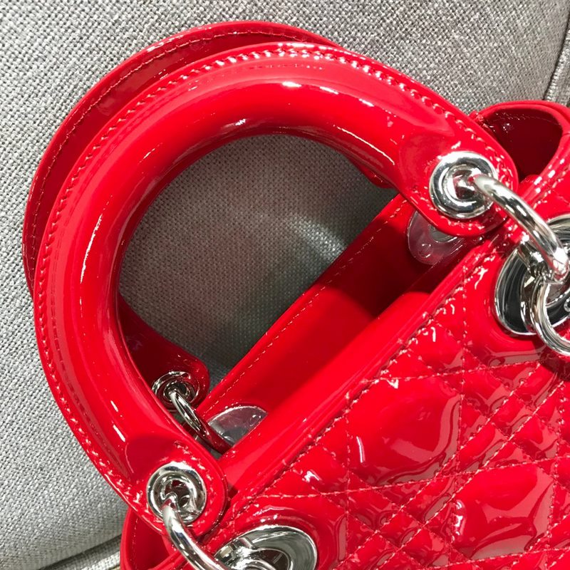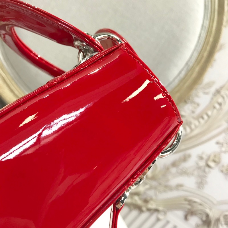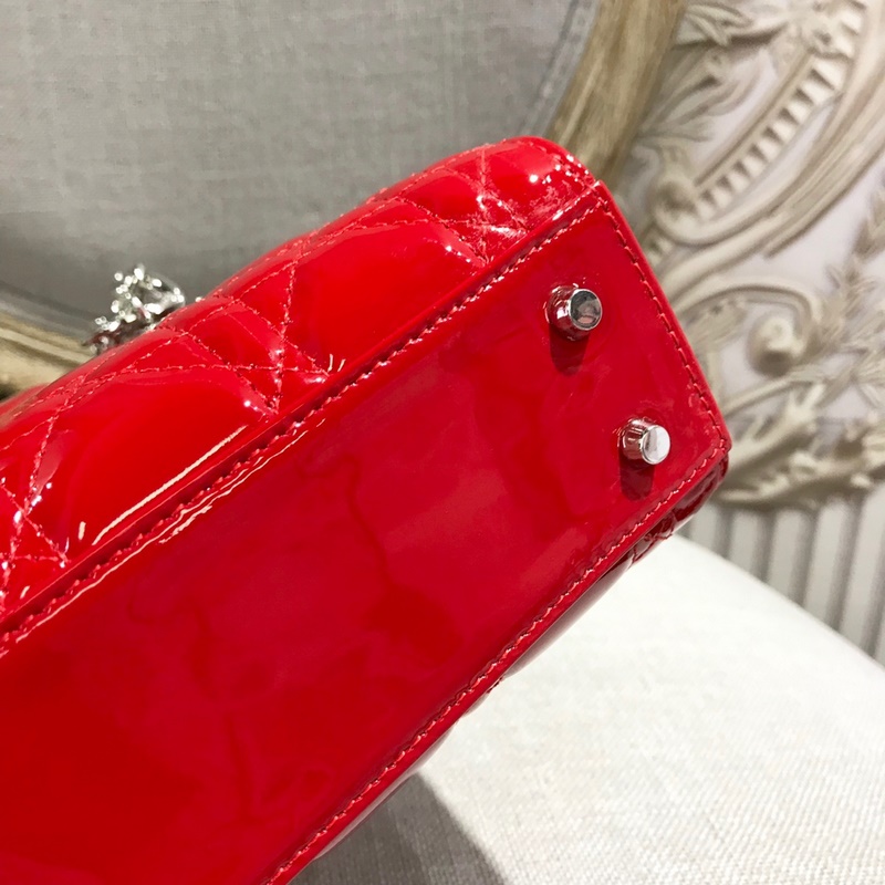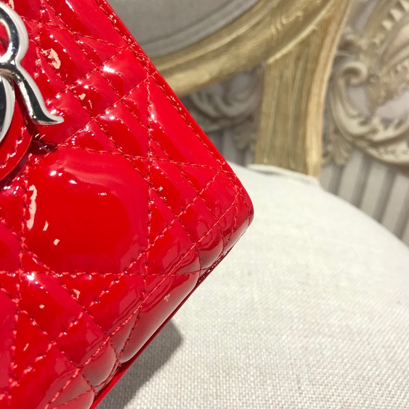 정품 디올 3칸 다이아나 특허 가죽 밝은 빨강색 실버 버클 디테일 m673 크기 17cm