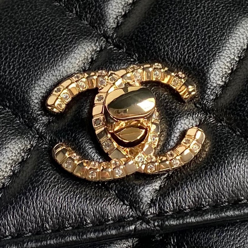 Chane1 24S 프리미엄 다이아몬드 핸들 A 4044 이 손잡이는 작은 다이아몬드로 장식되어 있으며 부드러운 양가죽과 짝을 이룹니다. 세부 사항이 가득하고 고급스러움과 섬세함이 완벽하게 표현되어 있습니다. 체인이 달린 클래식한 블랙 다이아몬드 퀼팅 가방은 그 자체로 우아하고 고급스러운 분위기를 자아냅니다~ 가방의 용량은 매우 만족스러웠습니다. 보기에도 아주 좋습니다! 크기: 18.5cm