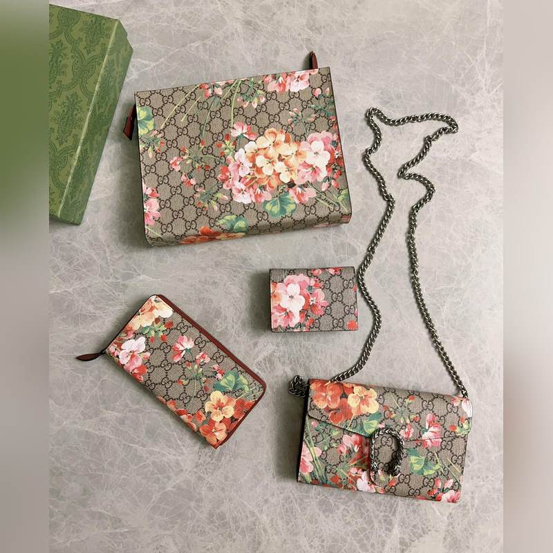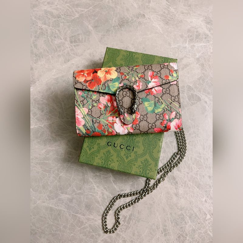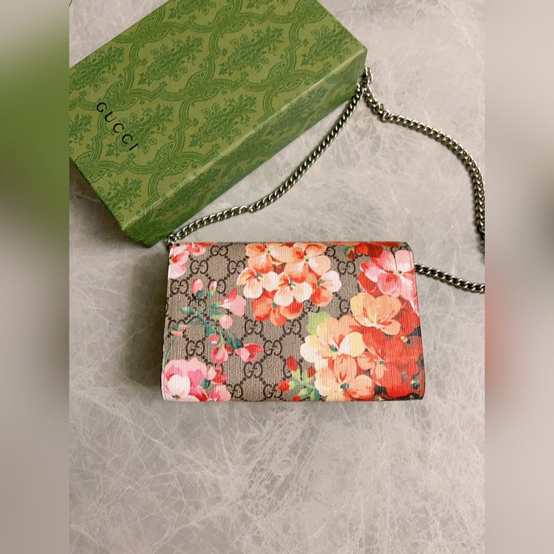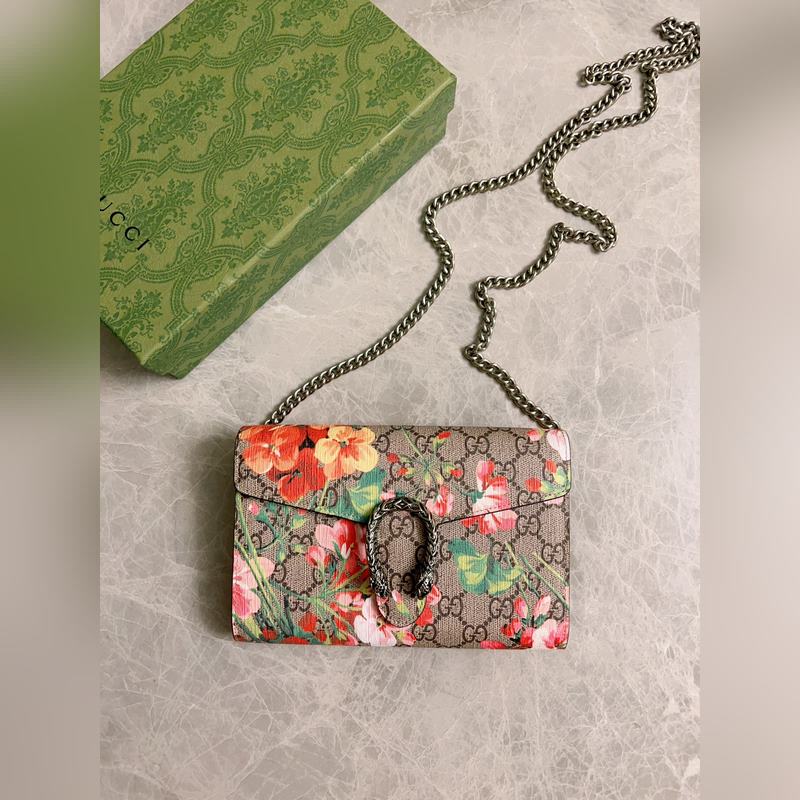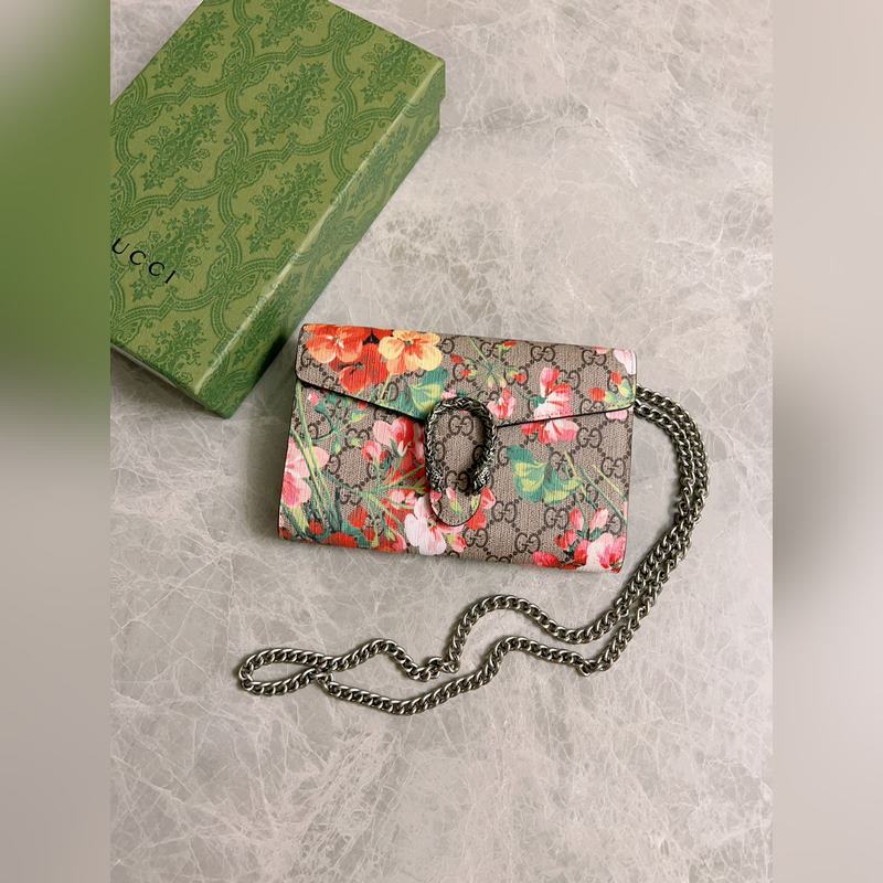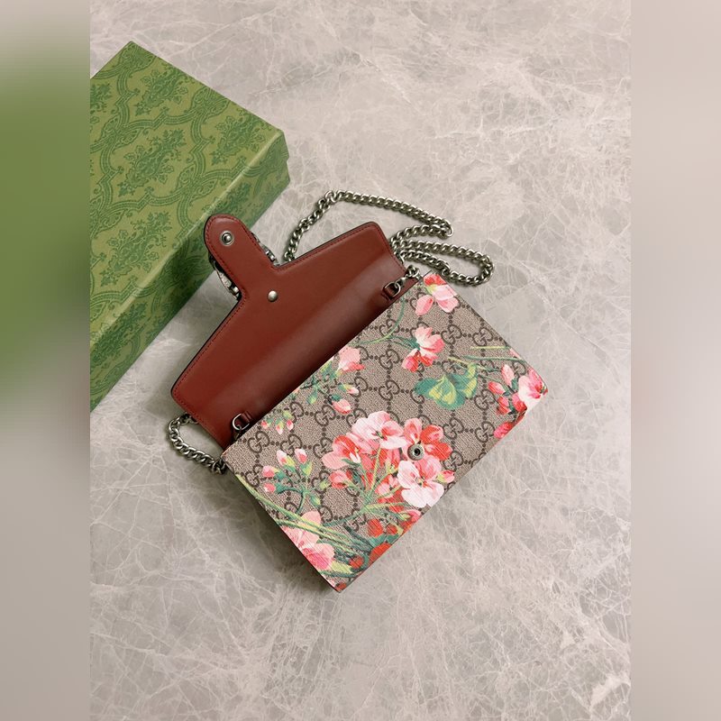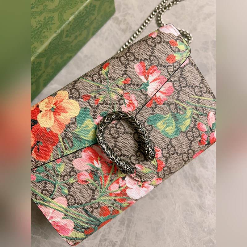 새로운 모델 ~ 디오니소스 시리즈 바쿠스 체인백: 구조적인 제라늄 프린트가 오리지널 소가죽과 결합되어 있으며 상징적인 프린트는 직조된 호랑이 박차 버클로 보완됩니다. 모델 번호: 401231 색상: 핑크 플라워/로즈 레드 아이스 블루 플라워/로얄 블루 가죽 크기: 20x15x4cm