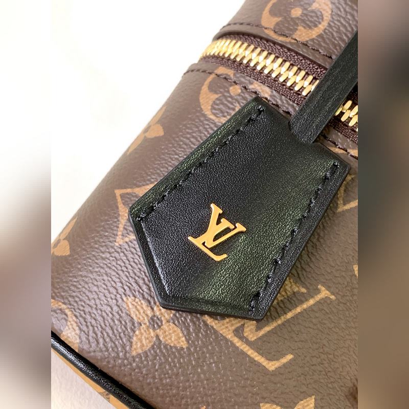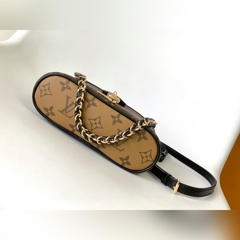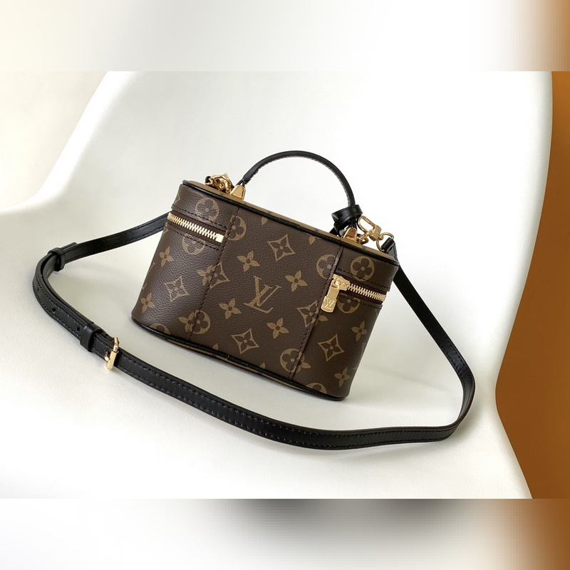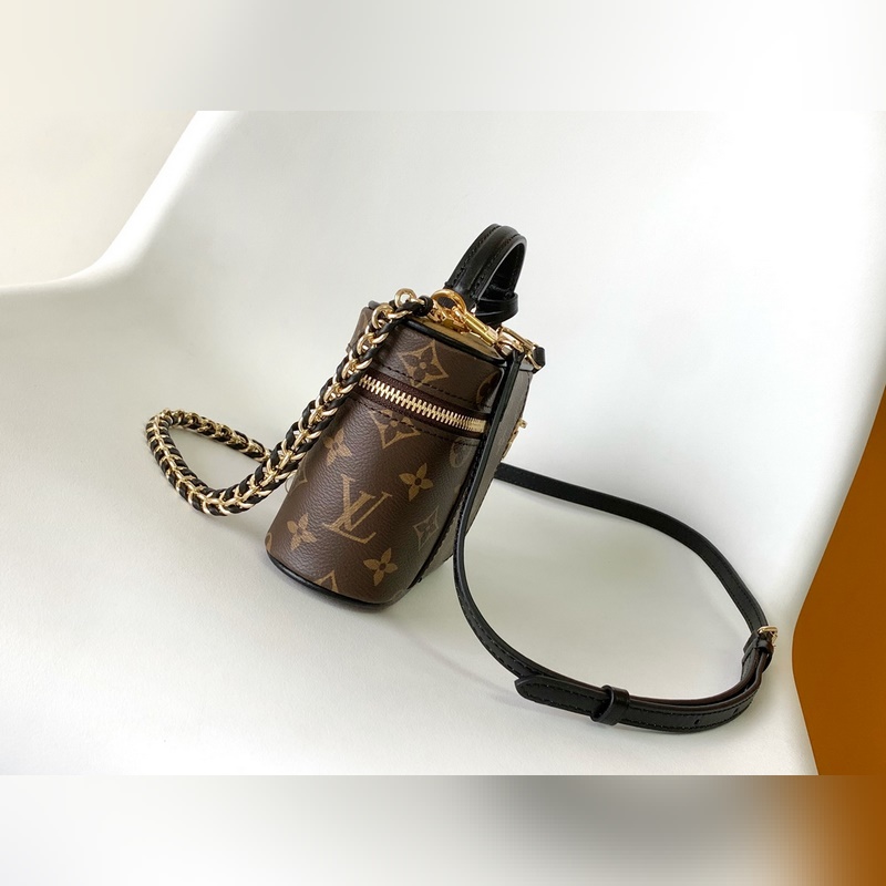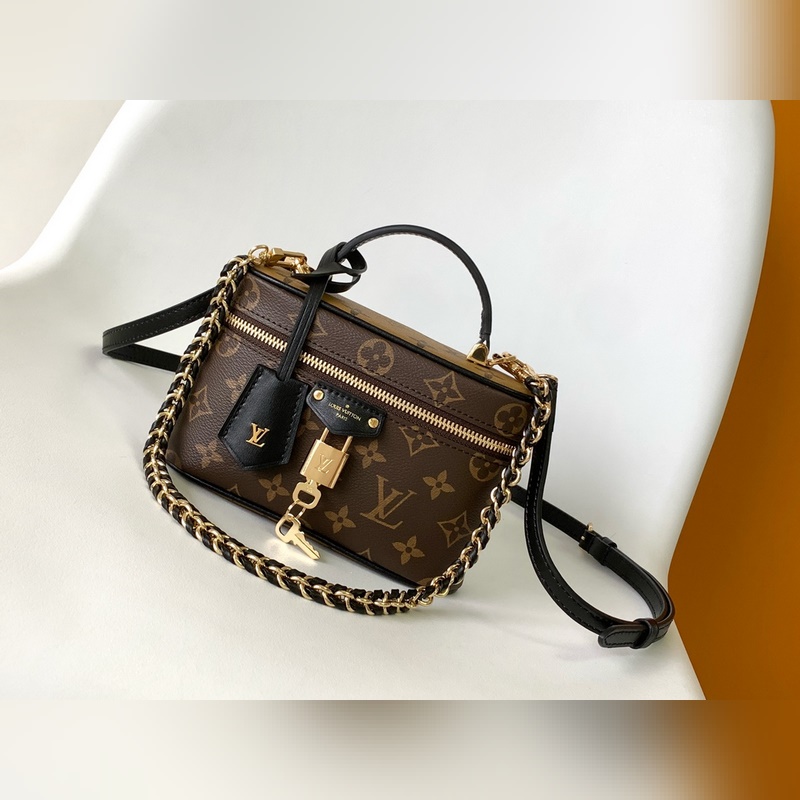 LV Vanity Chain M47125 실제 사진 구식 Vanity Chain ouch 핸드백 클래식한 화장품 케이스에서 영감을 받은 여행 정신이 모노그램 캔버스에 표현되어 있습니다. 상단 손잡이와 탈착식 직조 체인에는 가죽 요소가 포함되어 있어 가방의 단순한 라인과 대비를 이룹니다. LV 모노그램 자물쇠와 가죽 키 케이스는 상징적인 디테일을 이어갑니다. 크기: 19 x 11.5 x 6.5cm