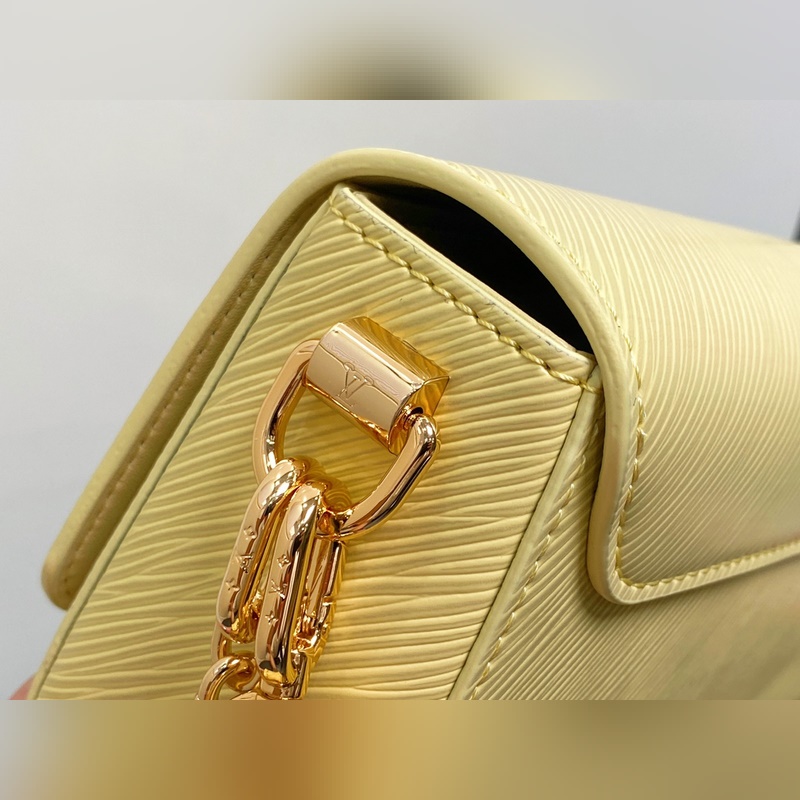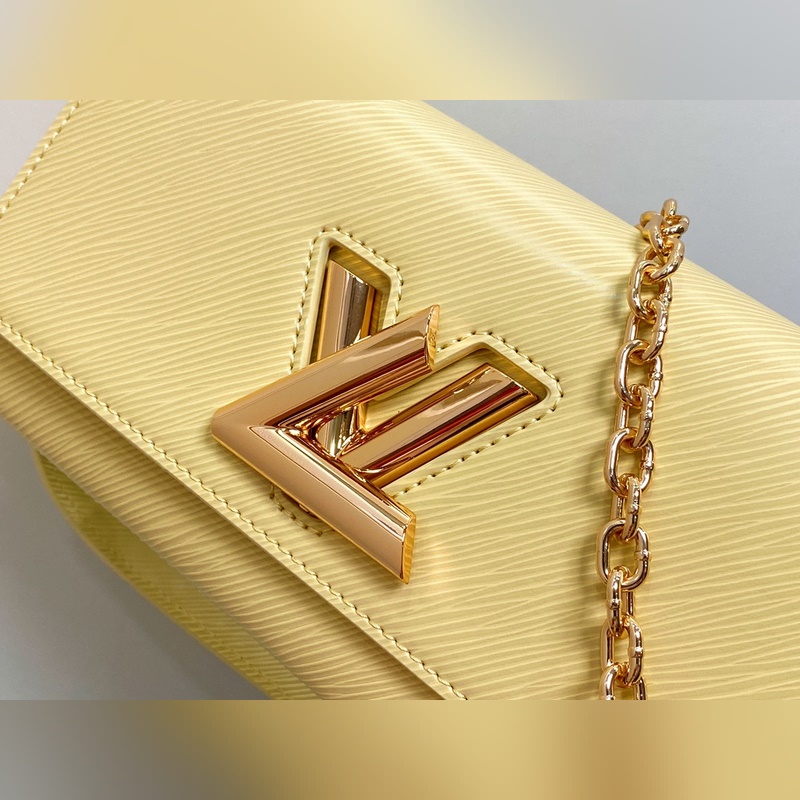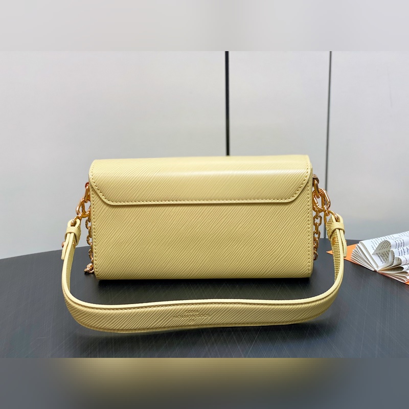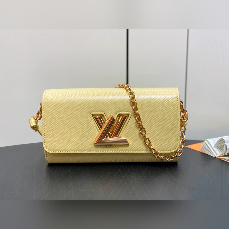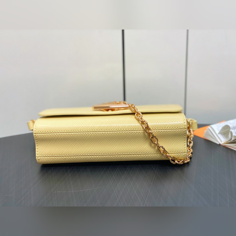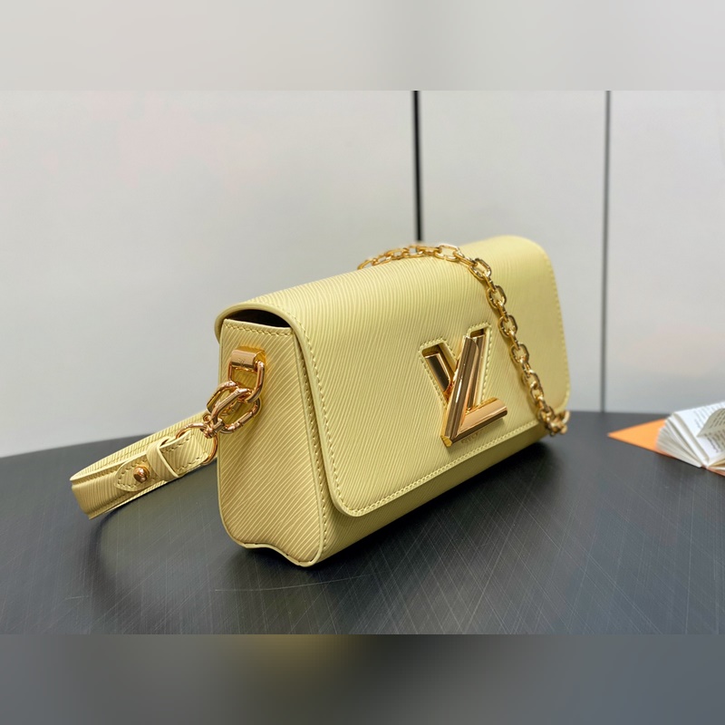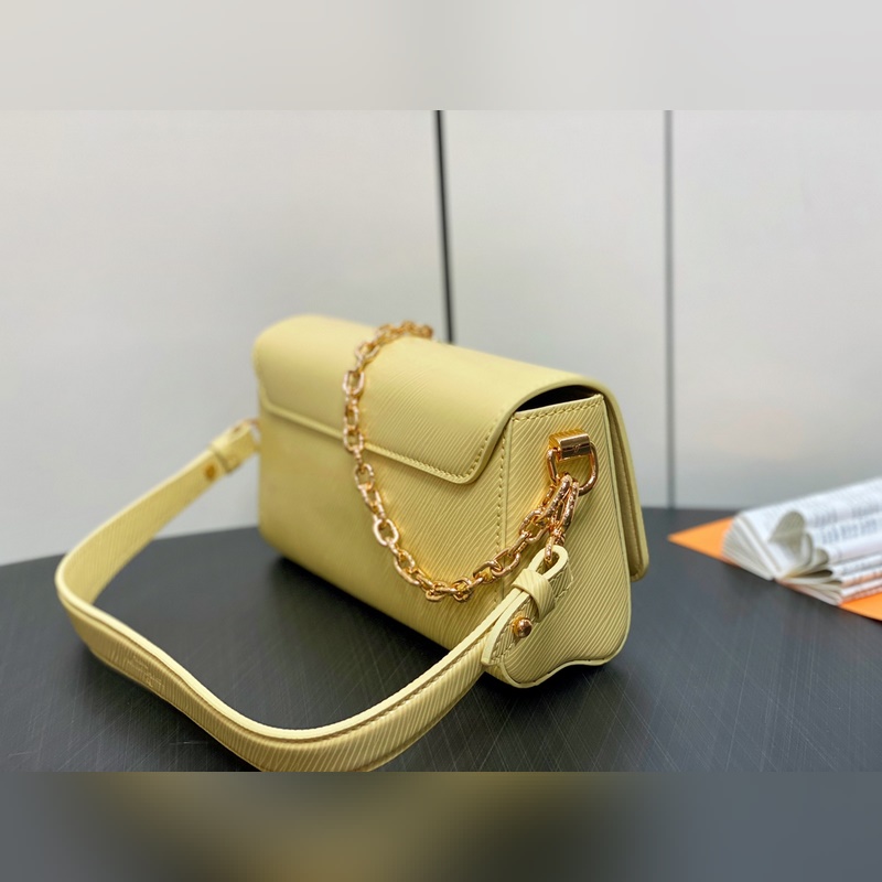 [LV] M24550 옐로우 트위스트 웨스트 핸드백 M24550 24549 24566 24548 트위스트 웨스트 핸드백은 날씬한 모양과 클래식한 디자인으로 시원한 계절감을 선사합니다. E i 가죽은 현대적인 색조로 염색되었으며 LV 트위스트 잠금장치는 브랜드 정체성을 강조합니다. 탈부착 가능한 어깨끈과 체인이 함께 제공되므로 일상 필수품을 다양한 방법으로 휴대할 수 있습니다. 크기: 23.5 x 12.0 x 7.0cm.