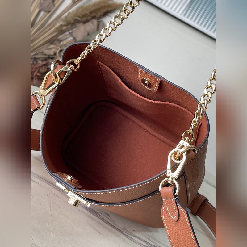 LV M24006 브라운 락 앤 워크 버킷 백은 가볍고 편안한 그레인 소가죽으로 만들어져 편안한 프랑스 스타일을 자아냅니다. 큰 앞쪽 수납공간은 트위스트 잠금장치로 열 수 있어 가지고 다니기 편리한 물건을 쉽게 넣고 뺄 수 있습니다. 탈착식 어깨끈과 체인 손잡이는 다양한 운반 옵션을 제공합니다. 크기: 20 × 20.5 × 12cm