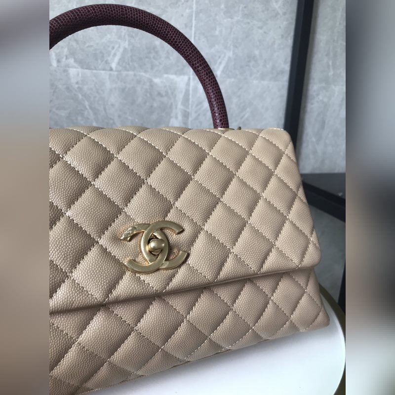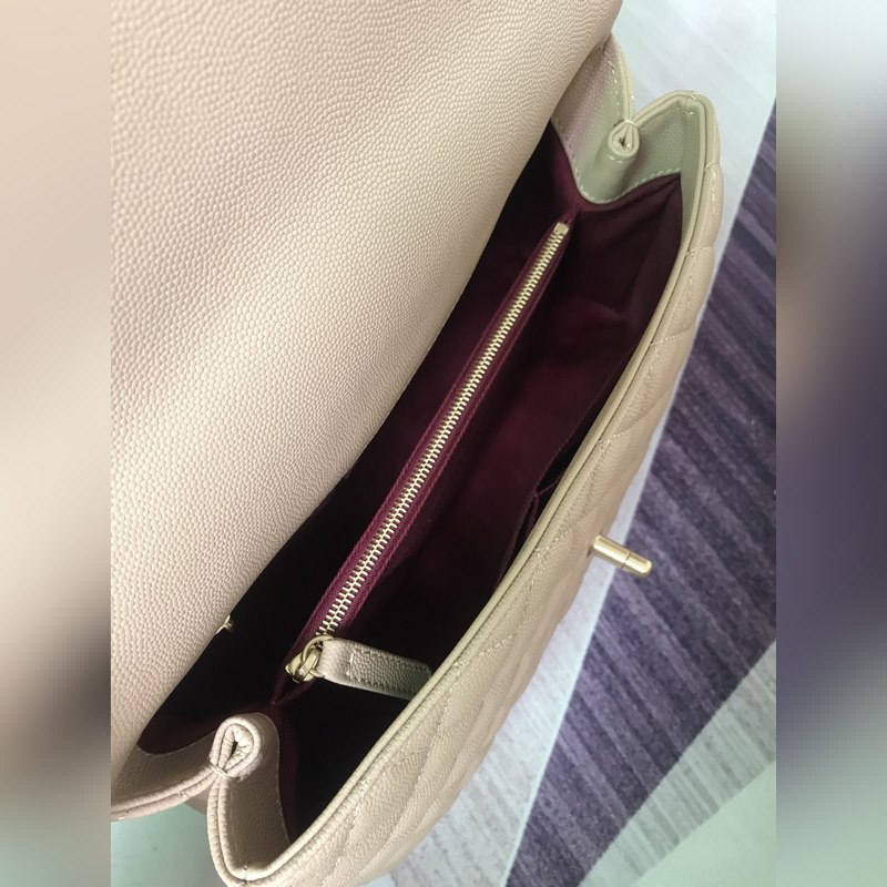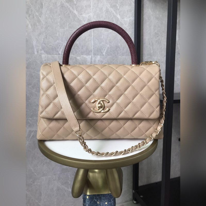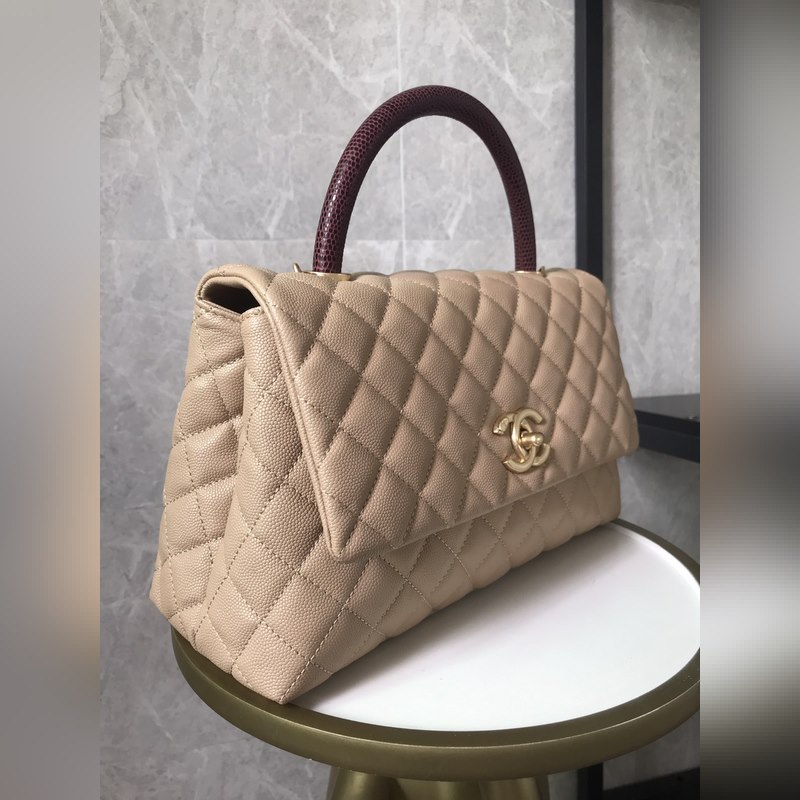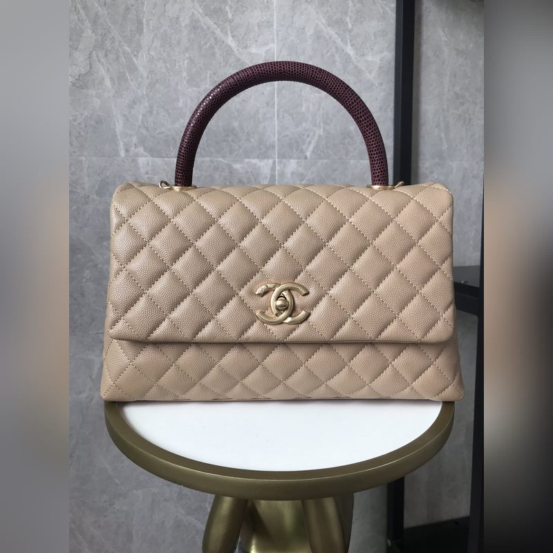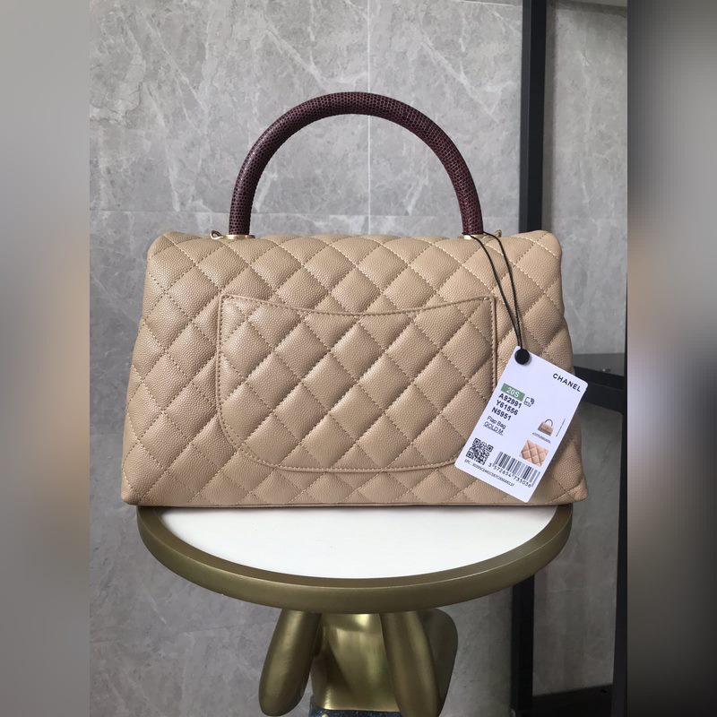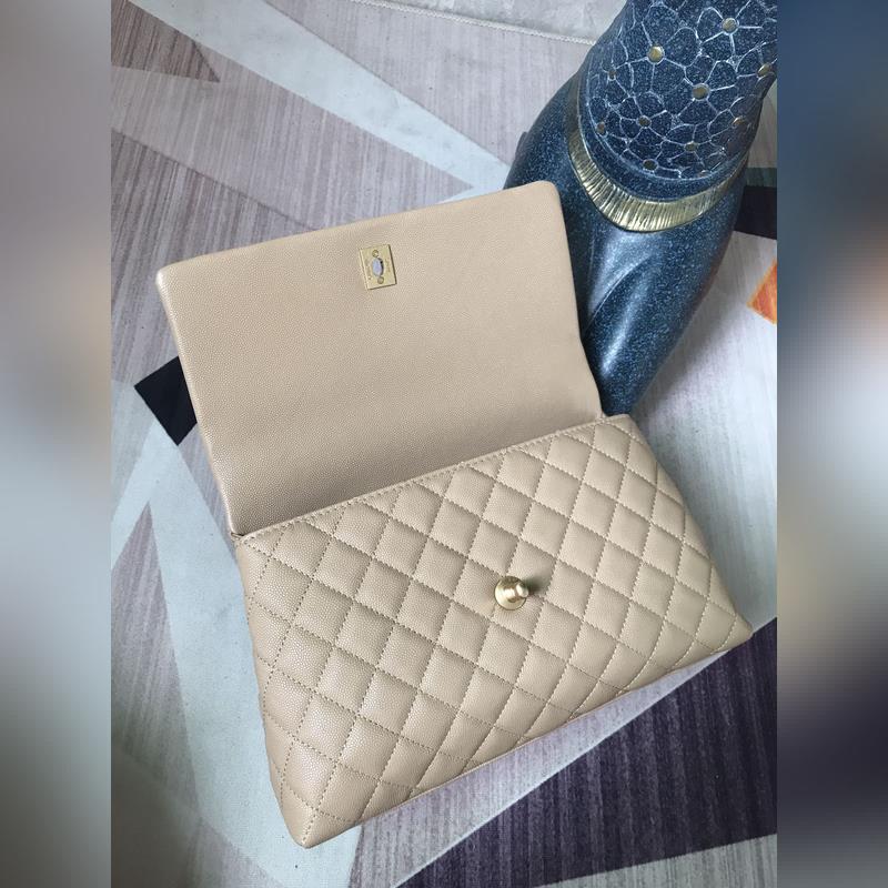 A92991 최신 프리즘 무늬의 세밀한 엠보싱 송아지 가죽 소재의 어깨 크로스바디 핸드백 중간 크기 플랩 잠금장치 적갈색 도마뱀 무늬 핸들 엠보싱 세밀한 송아지 가죽 소재 적갈색 도마뱀 무늬 핸들 금도금 금속 크기 18×29×12cm 베이지
