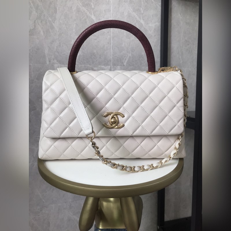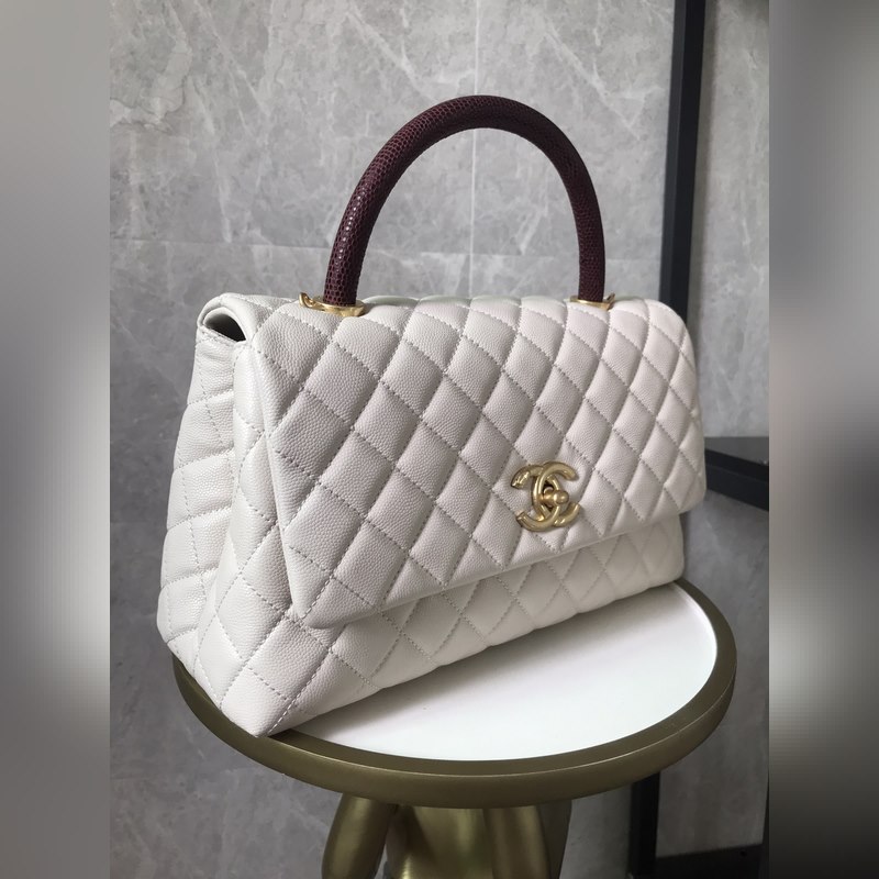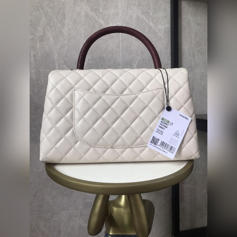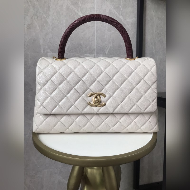 A92991 최신 프리즘 무늬의 세밀한 엠보싱 송아지 가죽 소재의 어깨 크로스바디 핸드백 적갈색 도마뱀 무늬의 플랩 잠금장치 손잡이 포함. 엠보싱 송아지 가죽 적갈색 도마뱀 무늬 금도금 금속. 크기 18×29×12cm 흰색