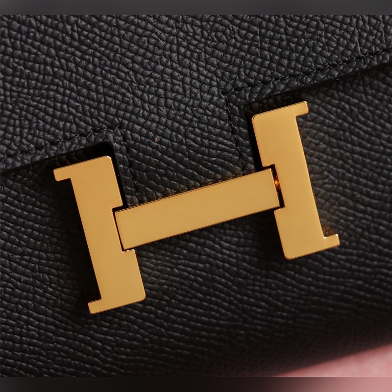 (검정색) 콘스탄스 크로스 바디 백 상세 보기 색상 검정색 금색 버클 가죽 에솜 [재고 있음] (크기: 길이 20.5cm x 폭 13cm x 두께 2cm) 에르메스 다강 크로스 바디 백 어깨 스트랩 H 자형 잠금장치 카드 슬롯 12개 지폐 주머니 2개 중앙 지퍼 동전 지갑 1개 앞주머니 1개 뒷주머니 1개