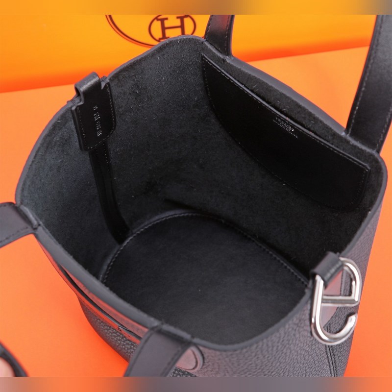 18 (어깨끈 포함) 검은색과 은색 H 피기백은 독특하고 절제된 디자인이 특징입니다. 손잡이와 바닥은 피기백의 고전적인 형태를 유지하고 있으며 바구니의 전체적인 이미지도 꽤 잘 어울립니다~ 18cm