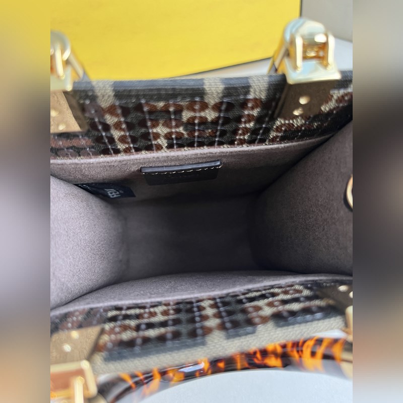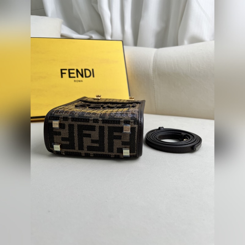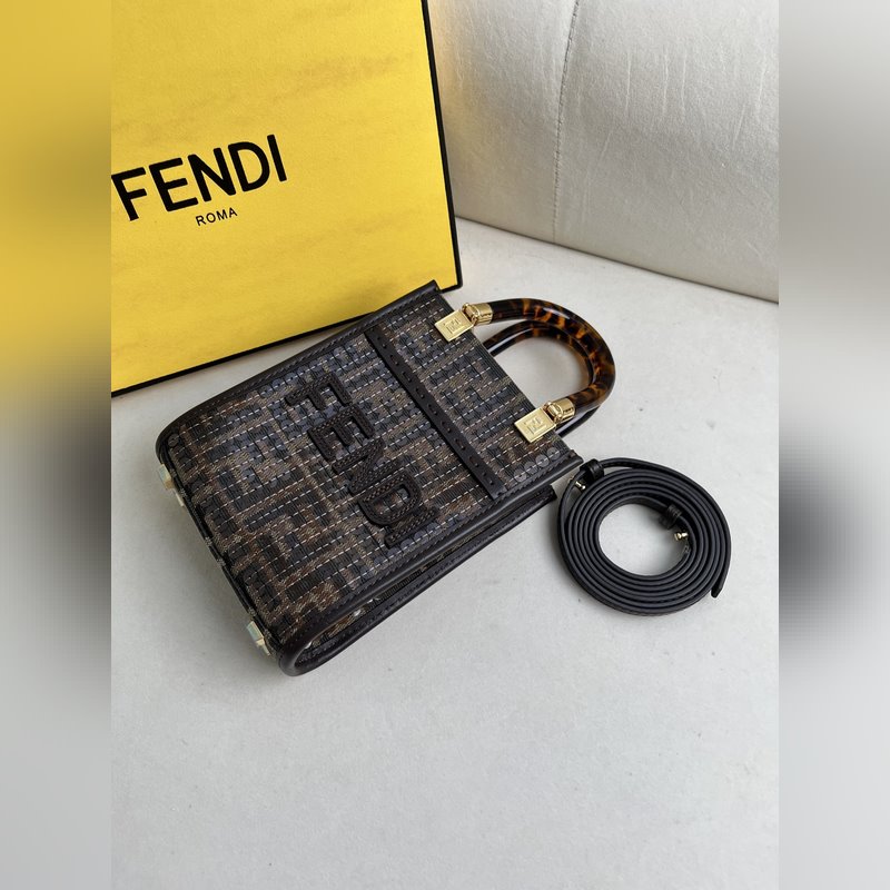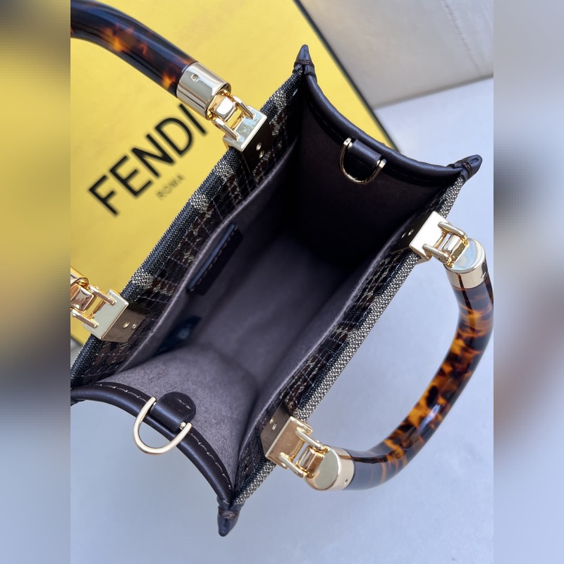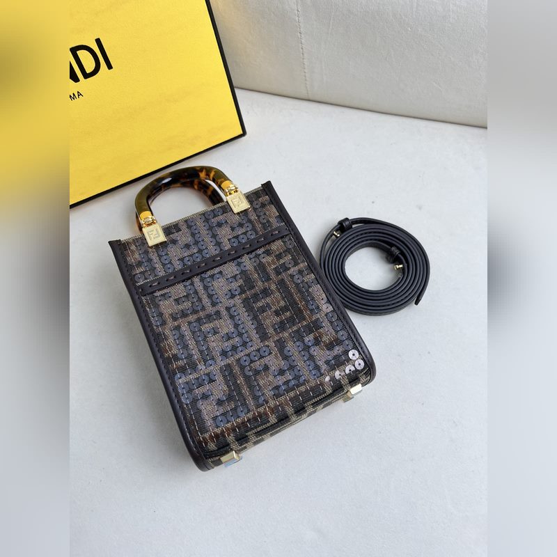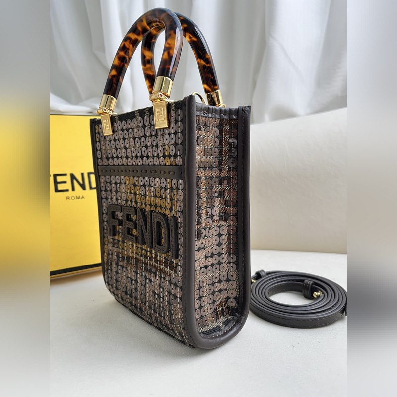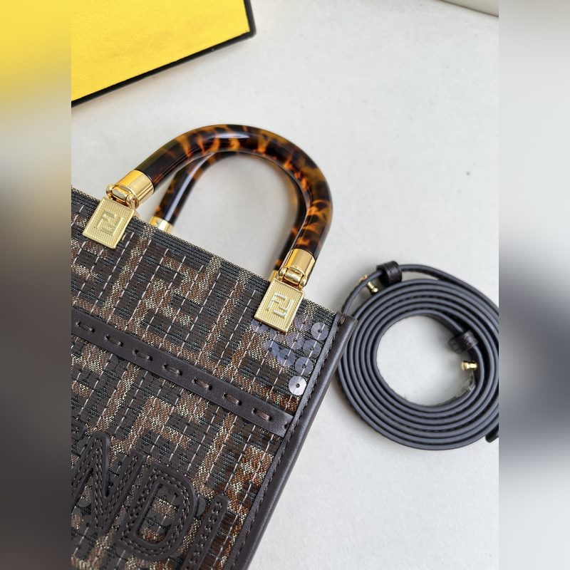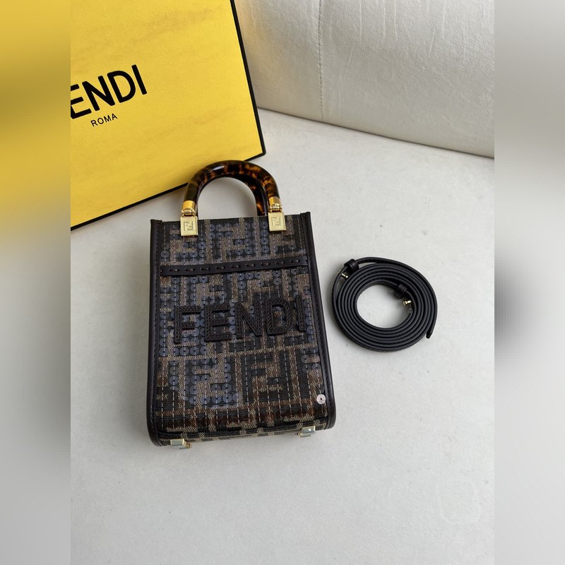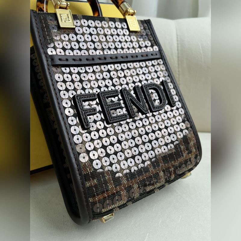 스팽글 꽃 아플리케 FF 모티브 자카드 자수가 전체적으로 새겨진 햇빛 미니 가방과 투명한 스팽글. 검은색 가죽 FENDI ROMA 레터링과 거북이 등껍질 효과의 단단한 레진 유리 손잡이. 안감은 검은색 가죽 테두리와 금색 금속 장식으로 마감되어 있습니다. 두 개의 손잡이와 조절 및 탈착이 가능한 얇은 어깨 끈을 이용해 손으로 들거나 어깨에 메고 다닐 수 있습니다. 사이즈 13/6.5/18cm 모델 번호: 8051