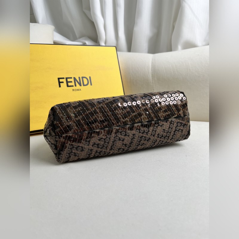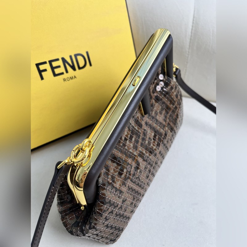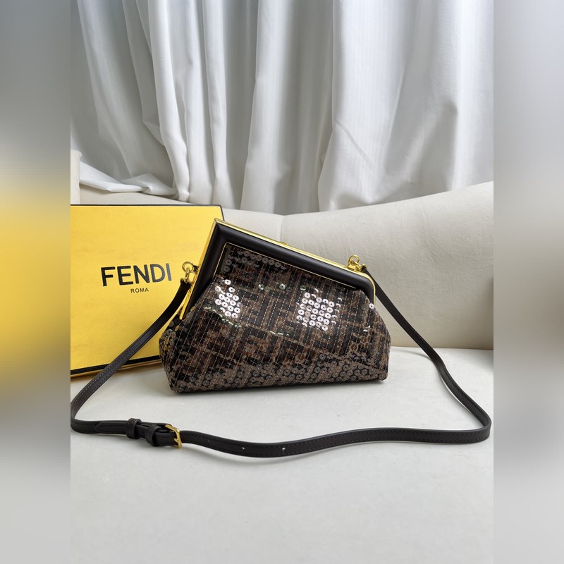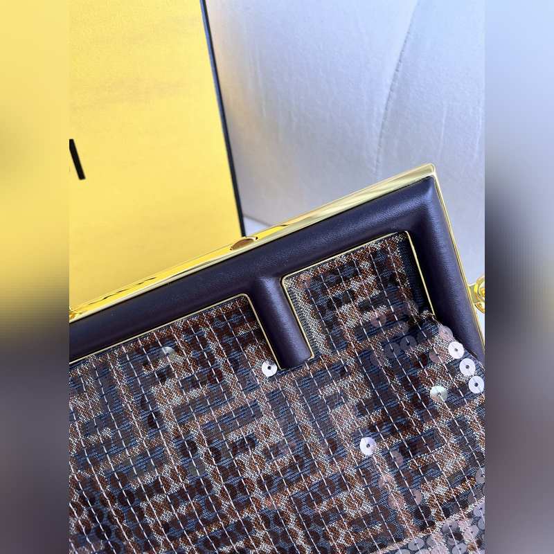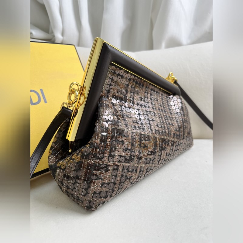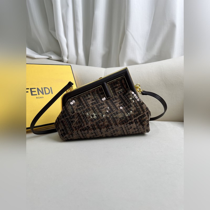 스팽글 꽃 펜디 첫 번째 작은 가방 패브릭 전체에 FF 패턴 자카드 자수 투명 스팽글 장식. 블랙 가죽 탈착식 숄더 스트랩이 있어 손으로 들거나 어깨에 메고 다닐 수 있습니다. 크기 26*9.5*18cm 모델 번호: 8129