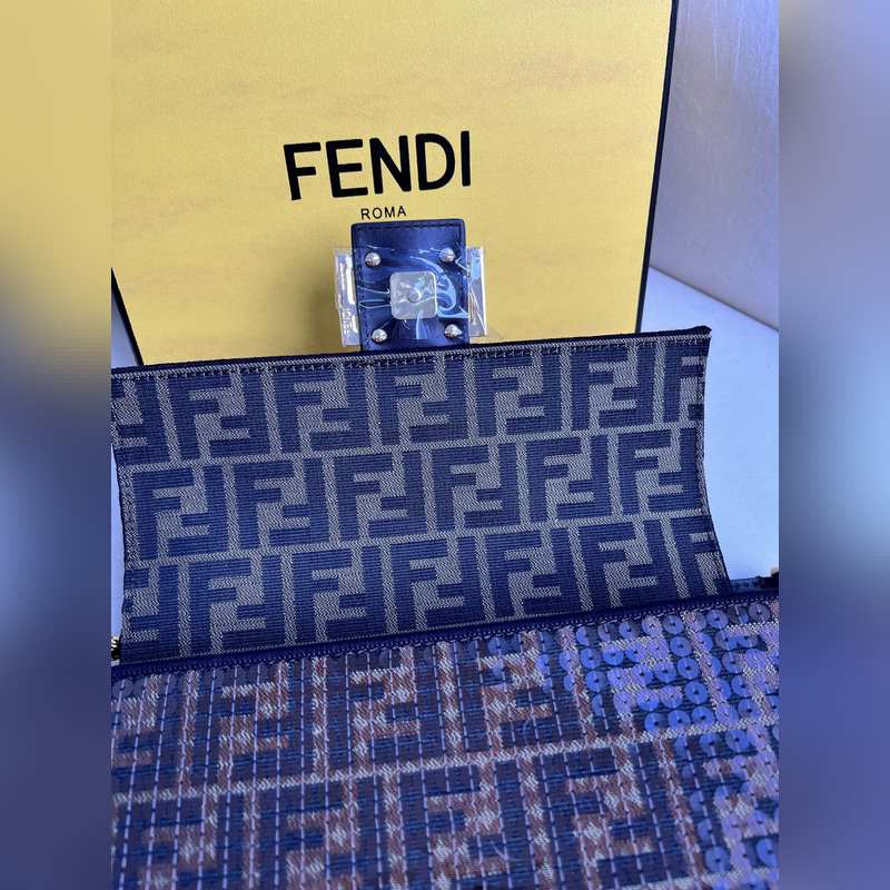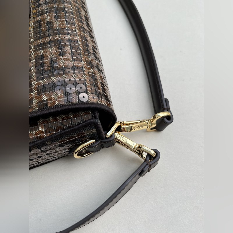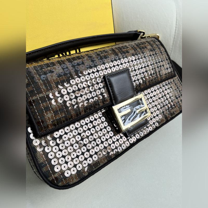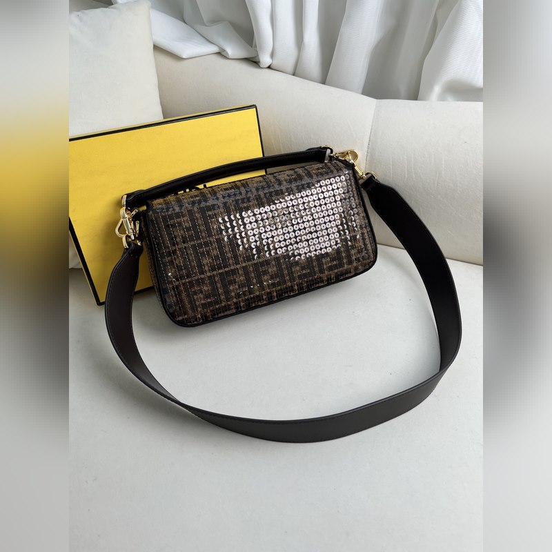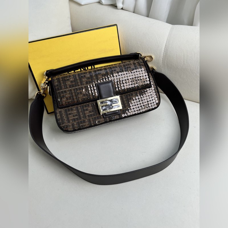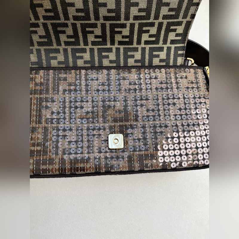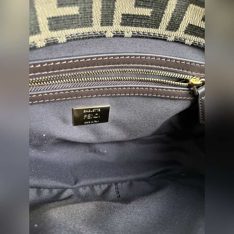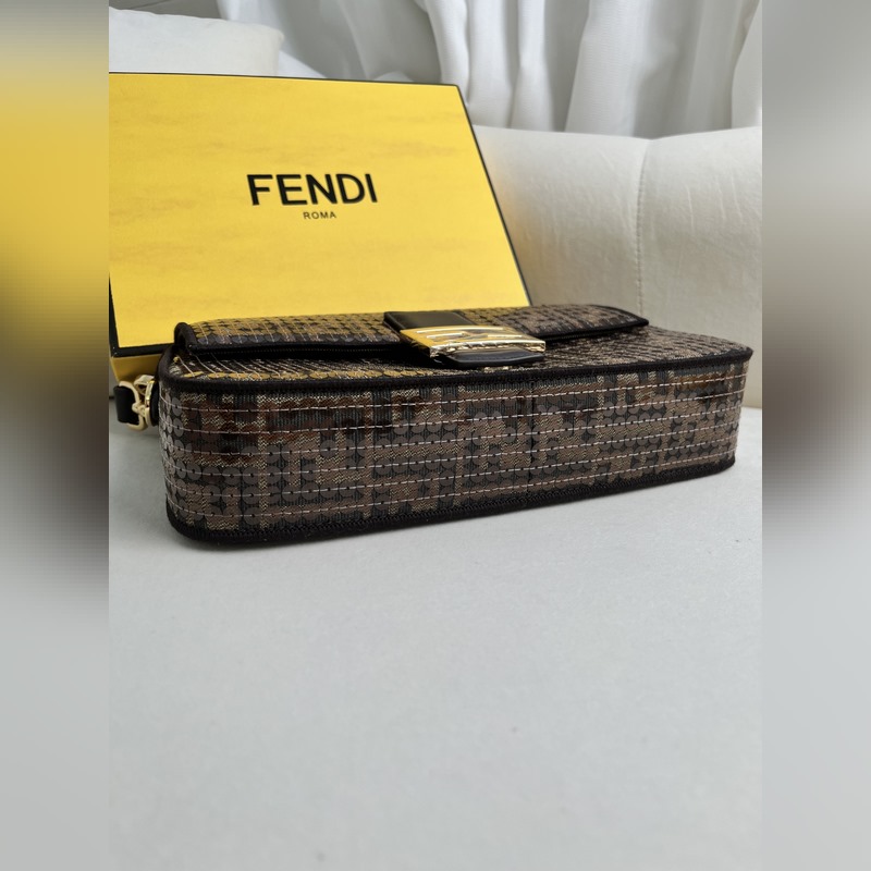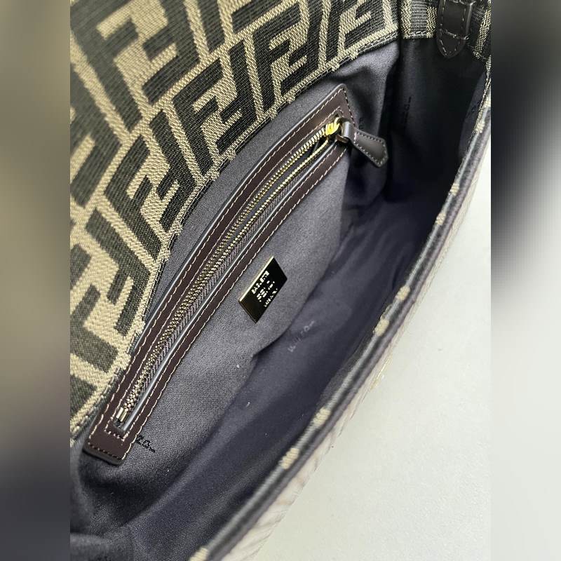 FF 모티브 자카드 자수가 전체적으로 새겨진 패브릭 소재의 중간 크기 바게트 핸드백. FF 버클로 마감. 앞면 플랩에 마그네틱 스냅 잠금장치 내부에 다크 브라운 패브릭 소재의 안감 지퍼 포켓 금색 금속 장식. 핸드백에는 탈착식 가죽 손잡이와 어깨 스트랩이 있어 손으로 들거나 어깨에 메거나 몸에 걸칠 수 있습니다. 크기: 26.15.5cm 모델 번호: 8600