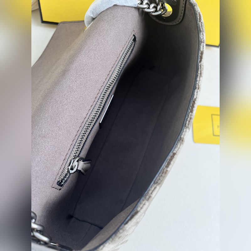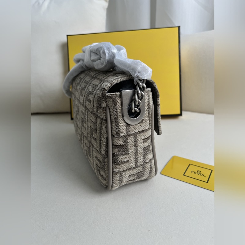 비둘기 깃털 아이코닉 바게트 아이코닉 FF 모티프가 있는 자카드 소재의 미디엄 체인 백. FF 버클로 장식되어 있으며 앞면 플랩 마그네틱 스냅 버튼 내부 수납 공간 지퍼 포켓 빈티지 골드 컬러의 금속 장식이 특징입니다. 가죽 인서트가 있는 슬라이딩 체인 숄더 스트랩이 포함되어 있으며 손으로 들거나 크로스 바디 또는 어깨에 메고 휴대할 수 있습니다. 크기 24x14x7cm 모델 번호: 232