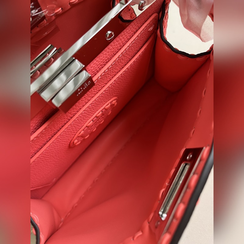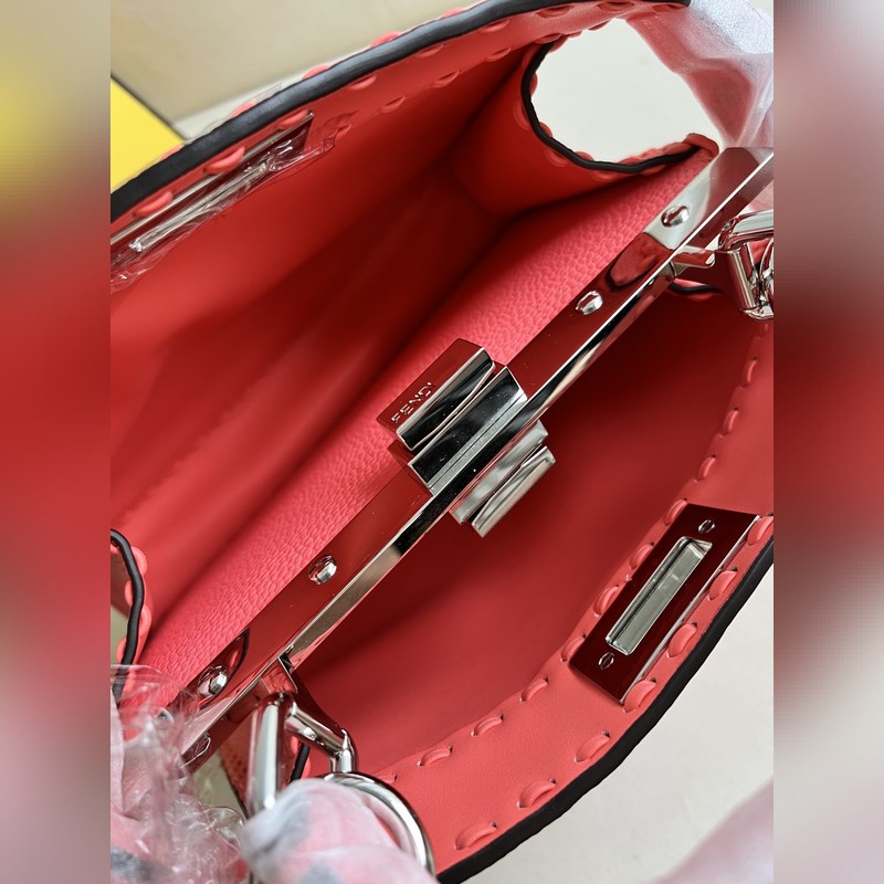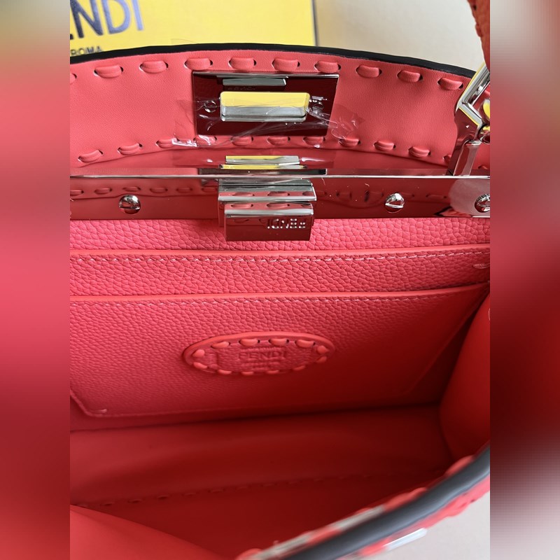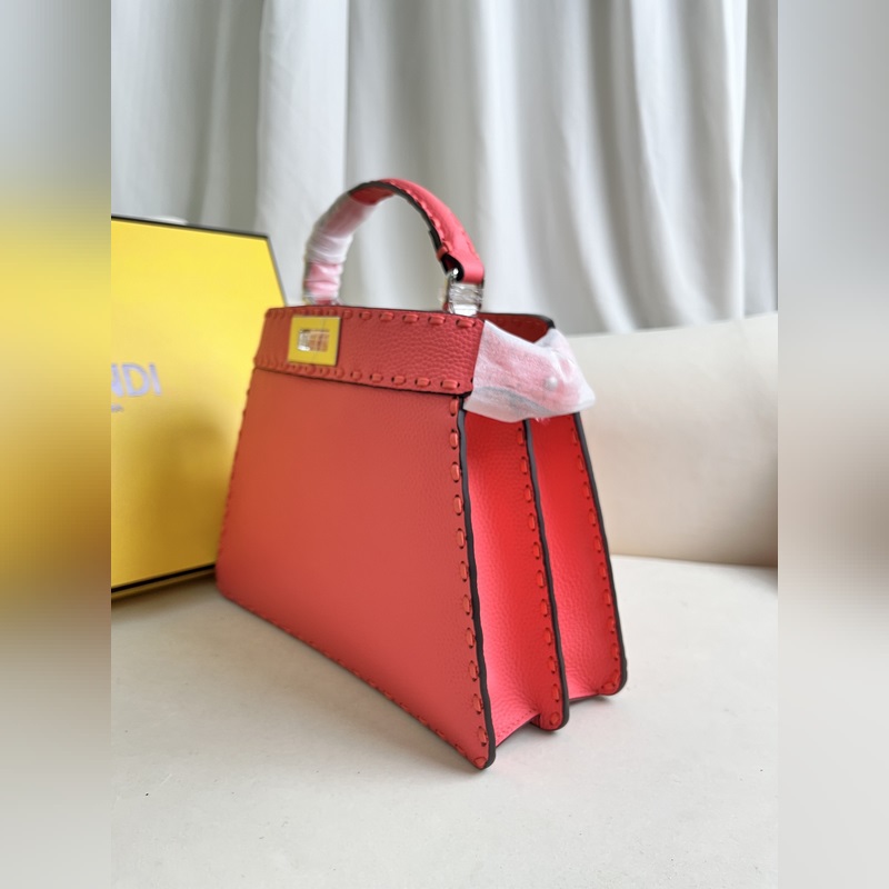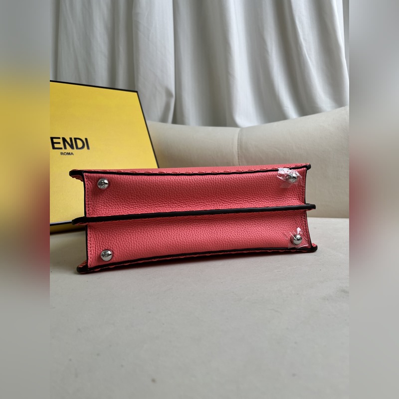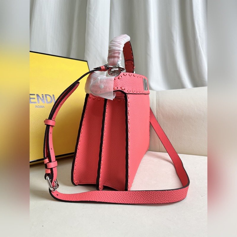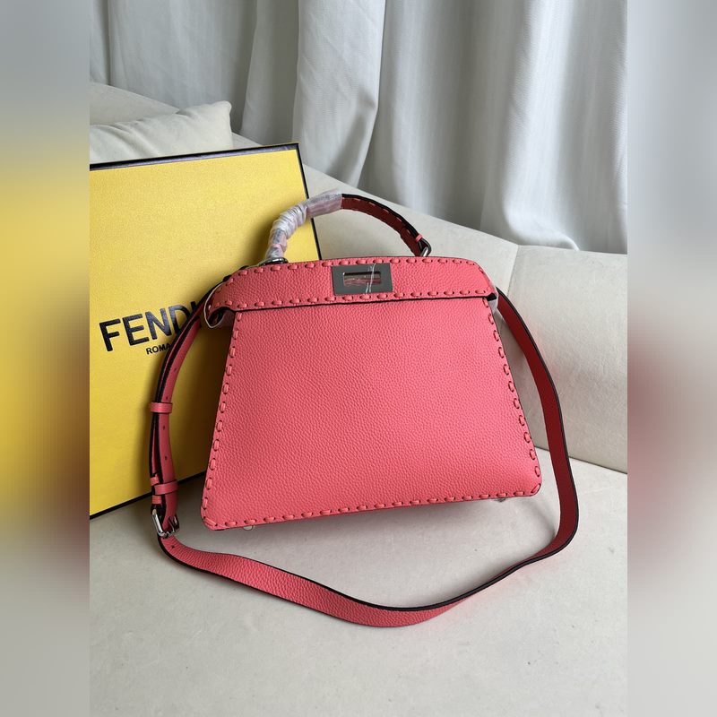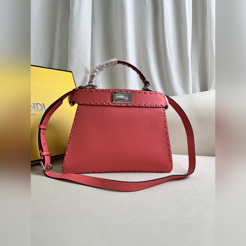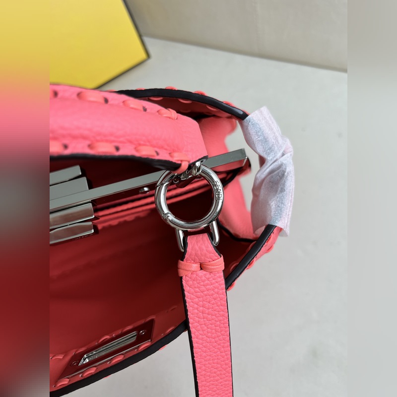 분홍색 FEND1eekabooISeeU 중간 크기의 핸드백으로 그레인 송아지 가죽 소재에 측면에 클래식한 트위스트 잠금장치가 달려 있고 부드러운 나파 가죽 안감이 있으며 딱딱한 칸막이로 구분된 두 개의 수납공간과 내부 지퍼식 포켓 금색 금속 장식 등이 특징입니다. 이 가방에는 손잡이와 조절식 탈착식 어깨끈이 달려 있으며 어깨끈은 거북이 등 껍질 모양의 잠금장치로 닫을 수 있습니다. 세련되고 시대를 초월한 가방 크기: 27*9.5*21cm 모델 번호: 8BN327