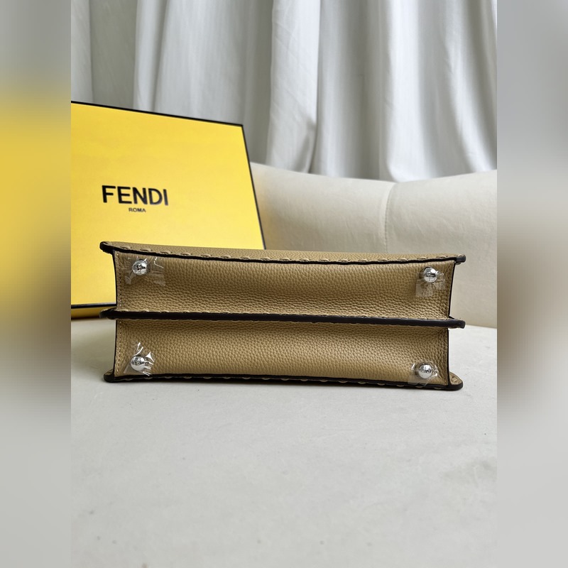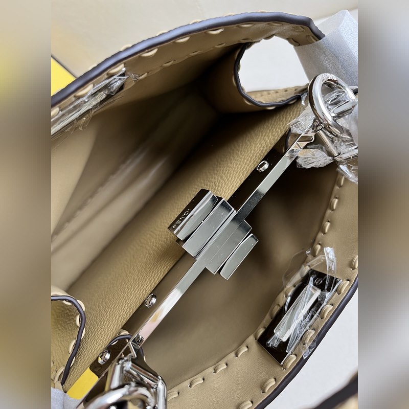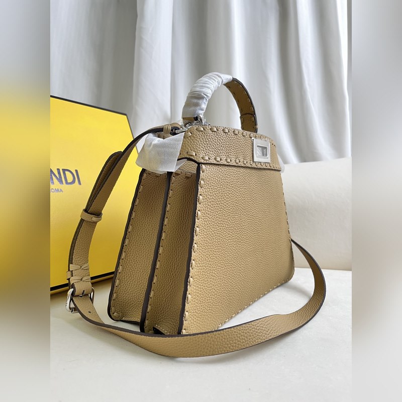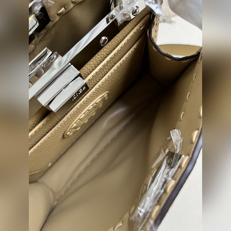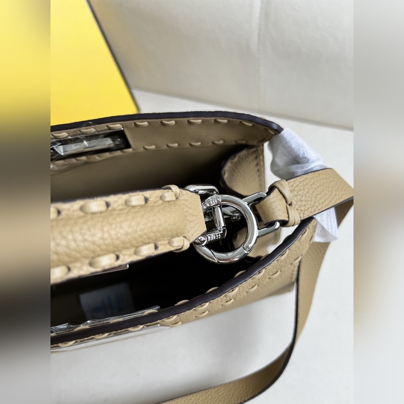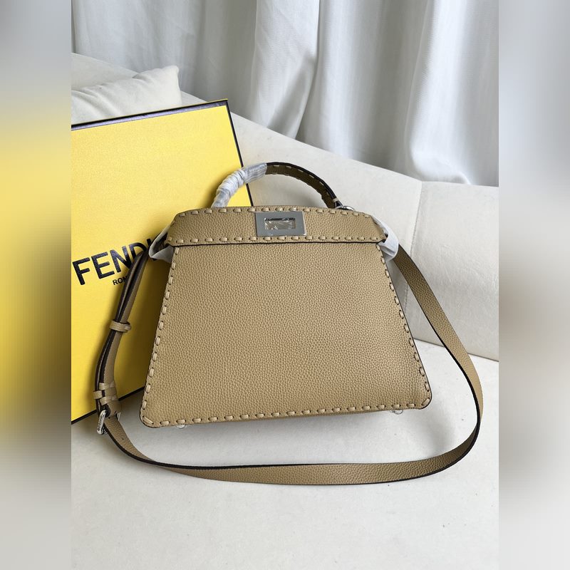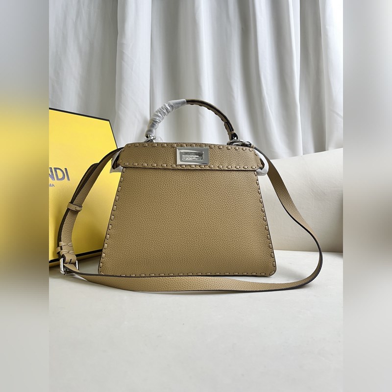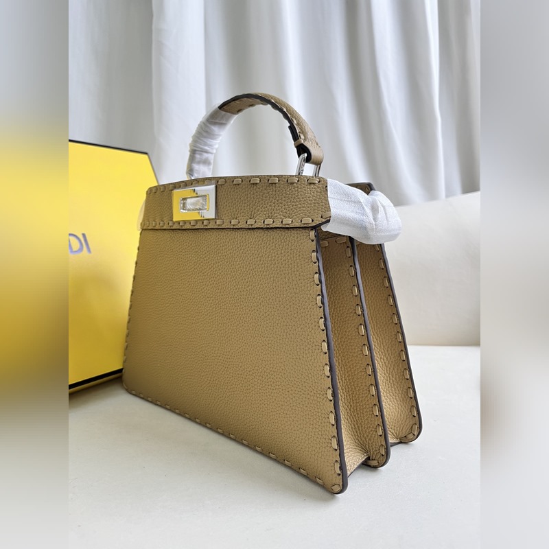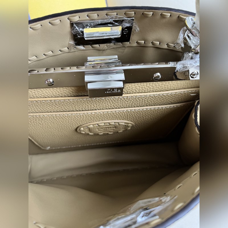 아몬드 FEND1eekabooISeeU 중간 크기의 핸드백으로 그레이니드 송아지 가죽 소재에 측면에 클래식한 트위스트 잠금장치가 달려 있고 부드러운 나파 가죽 안감이 있으며 딱딱한 칸막이로 나뉜 두 개의 수납공간과 걸쇠가 달린 내부 포켓 금색 금속 장식이 달려 있습니다. 핸드백에는 손잡이와 조절 가능한 탈착식 어깨끈이 달려 있으며 어깨끈은 거북이 등 껍질 모양의 걸쇠로 잠글 수 있습니다. 세련되고 튼튼한 가방 크기: 27*9.5*21cm 모델 번호: 8BN327